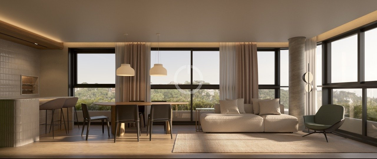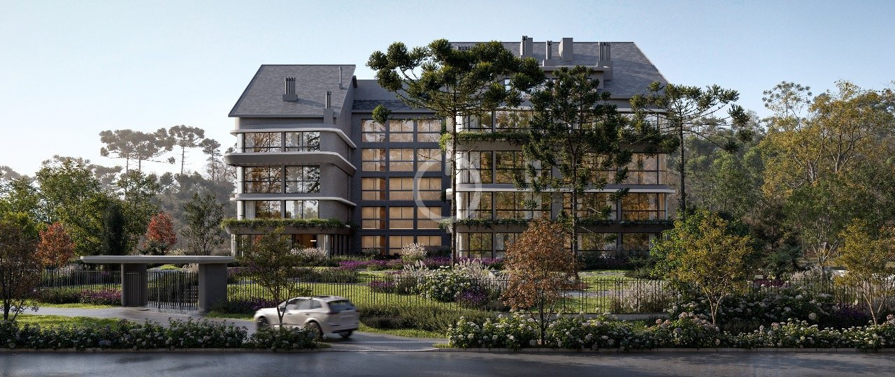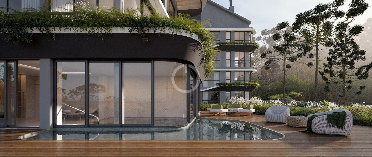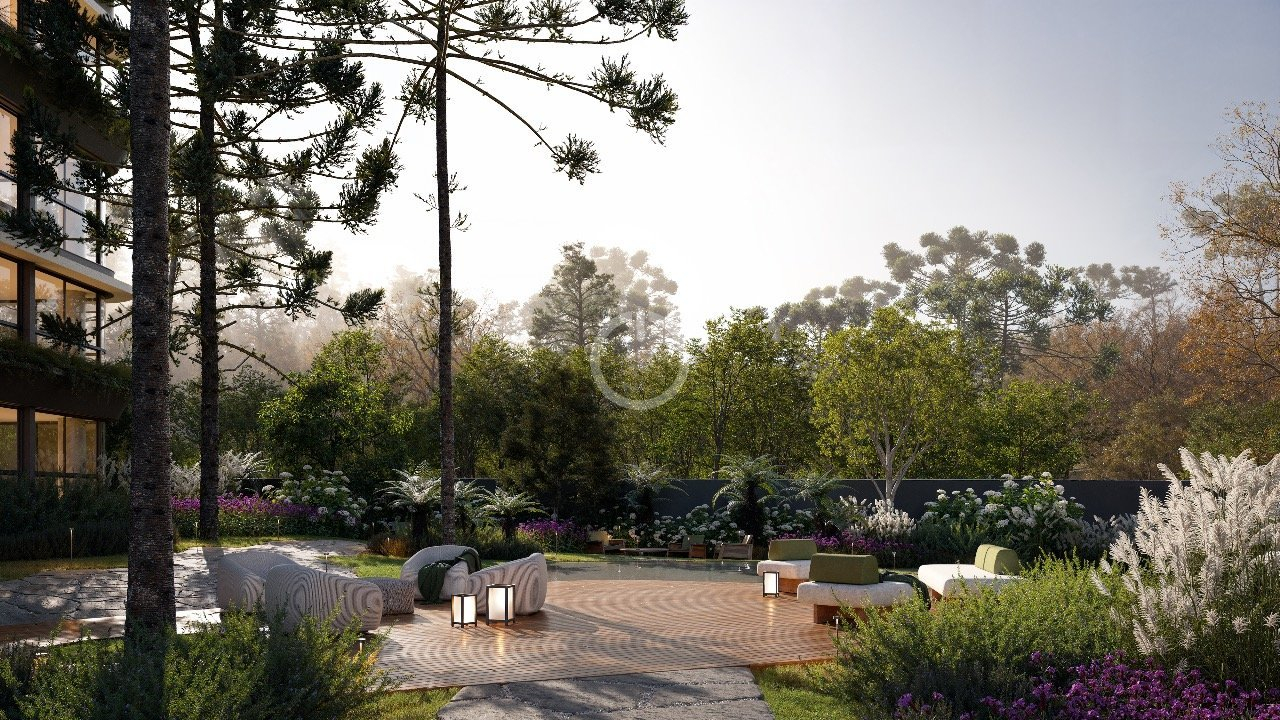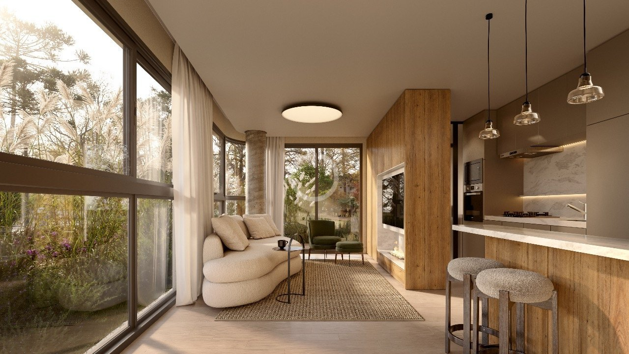 Os apartamentos são bem planejados, com espaços como sala de jantar, living com lareira e sacada integrada, que proporcionam uma vista deslumbrante para o jardim do condomínio.