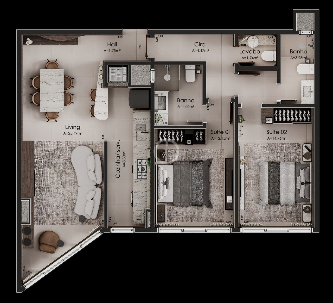2 dorm. | 2 suítes | 1 vaga | 87.61m² | Cód. 787 | Compartilhar no WhatsApp